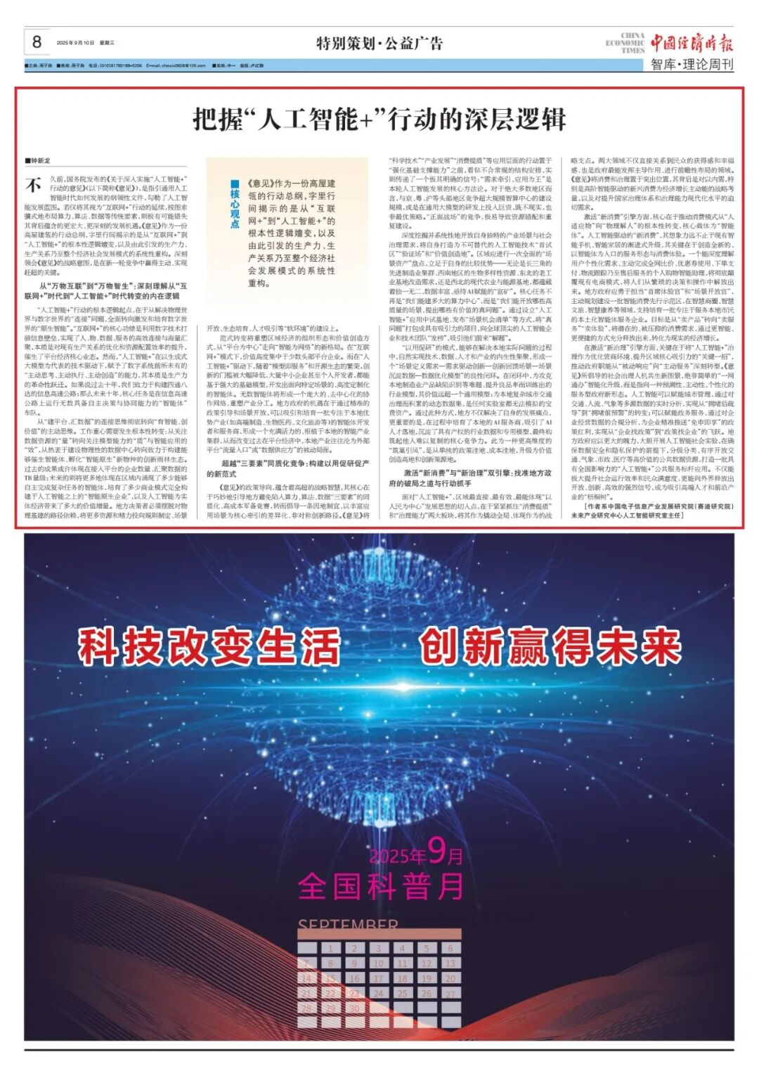 编者按作为引领新一轮科技革命和产业变革的战略性技术,人工智能已成为国际竞争的关键焦点、大国博弈的重要变量、经济发展的强大引擎。9月5日,国家主席习近平在向2025世界智能产业博览会致贺信时指出,当前,人工智能技术加速迭代演进,正在深刻改变人类生产生活方式、重塑全球产业格局。中国高度重视人工智能的发展和治理,积极推动人工智能科技创新与产业创新深度融合,赋能经济社会高质量发展,助力提升人民群众生活品质。继此前国务院出台《关于深入实施“人工智能+”行动的意见》后,9月8日,国家发展改革委、国家能源局印发《关于推进“人工智能+”能源高质量发展的实施意见》。中国经济时报围绕“人工智能+”行动的发展目标和重点方向,约请智库专家深度解读。